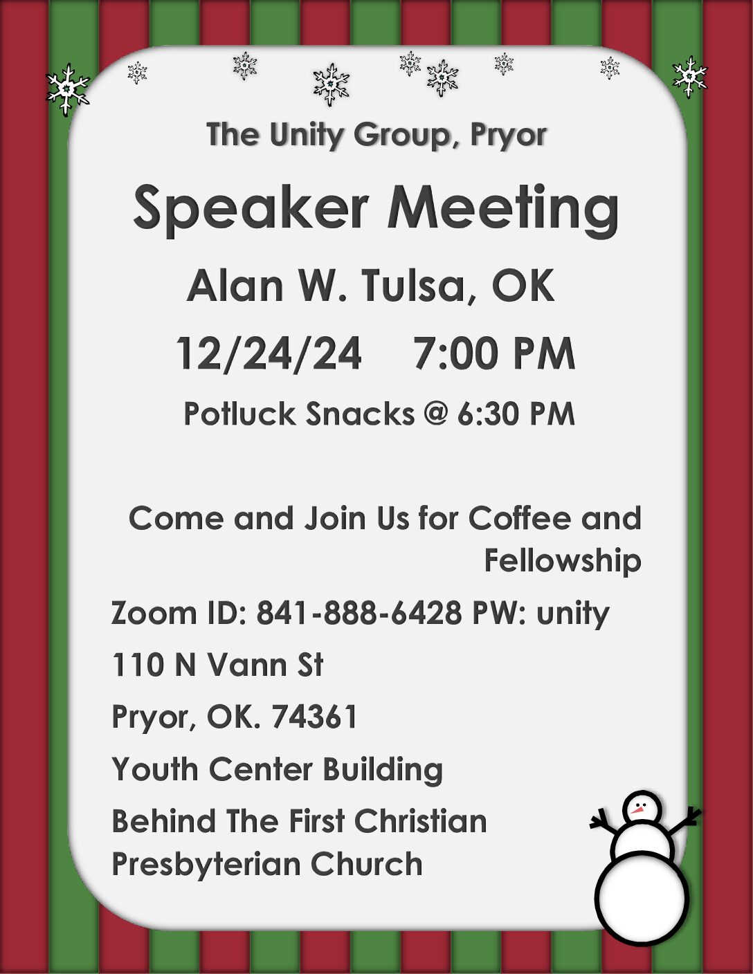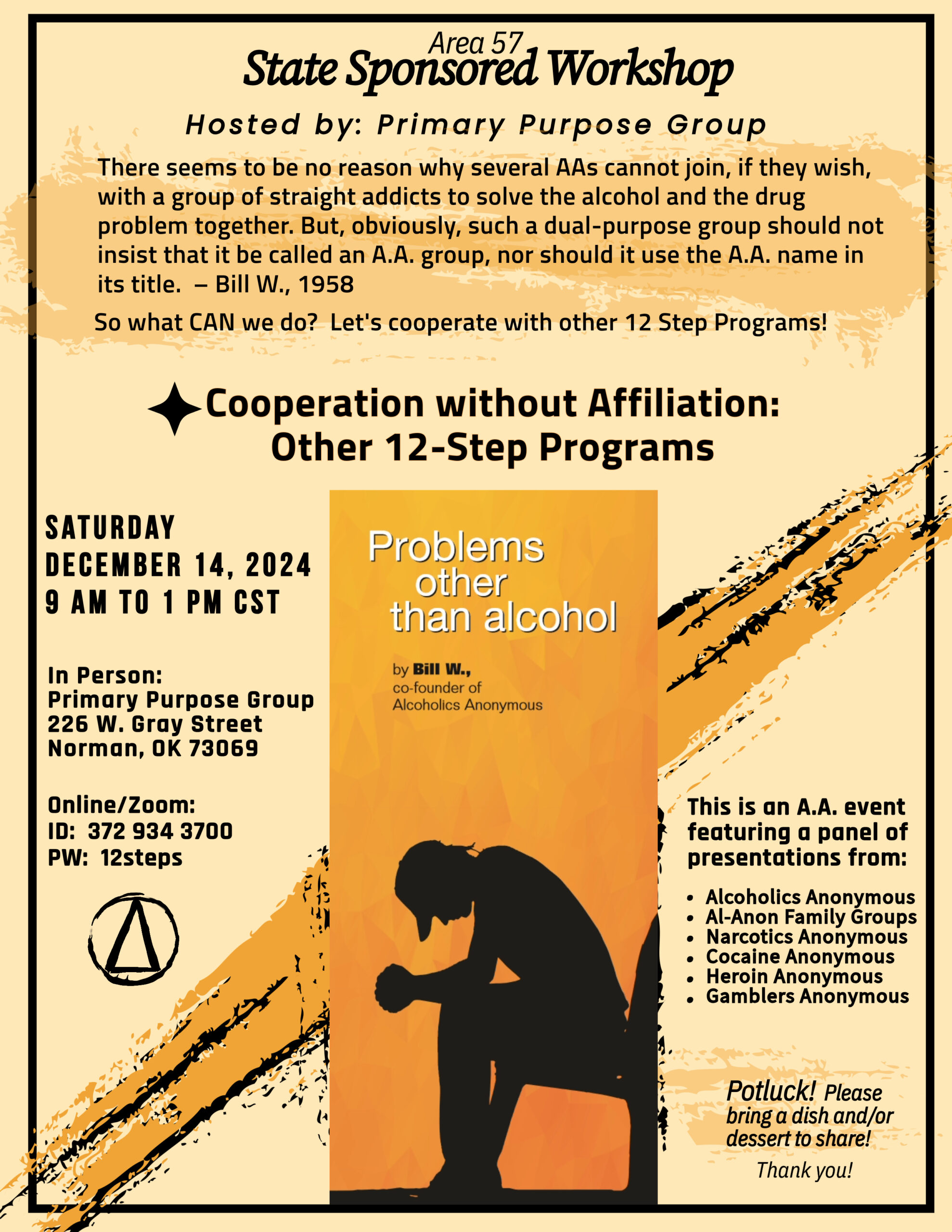 Please join the meeting to learn about the Tradition, Concept and Topic of the month. Fellowship at 6:00 and Meeting at 7:00 All are welcome! |